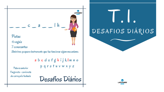 Colibri T.I. Desafios Diários O desafio de hoje é identificar a palavra da imagem! Bom desafio! Partilhe Partilhar no Facebook (Abre numa nova janela) Facebook Share on WhatsApp (Abre numa nova janela) WhatsApp Share on Pinterest (Abre numa nova janela) Pinterest Mais Imprimir (Abre numa nova janela) Imprimir Partilhar no Tumblr (Abre numa nova janela) Tumblr Share on Pocket (Abre numa nova janela) Pocket Gosto Carregando... Relacionado