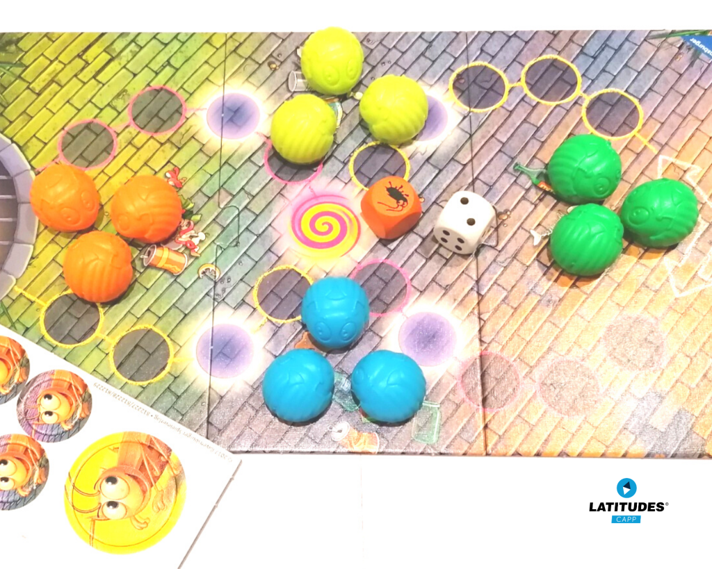 Material – Consiste num tabuleiro com casas rosa e amarelas, baratas azuis, verdes e laranjas e uma medalha com uma face rosa e outra amarela e dois dados (um comum e outro com duas faces com baratas).