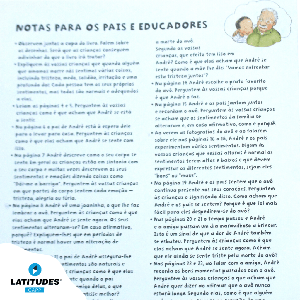 É naturalizado os sentimentos como também os comportamentos de cada um dos membros da família. É explicado a importância do chorar e das lembranças de momentos especiais que foram vividos em conjunto, de forma a integrar a perda, na vida do pequeno André.