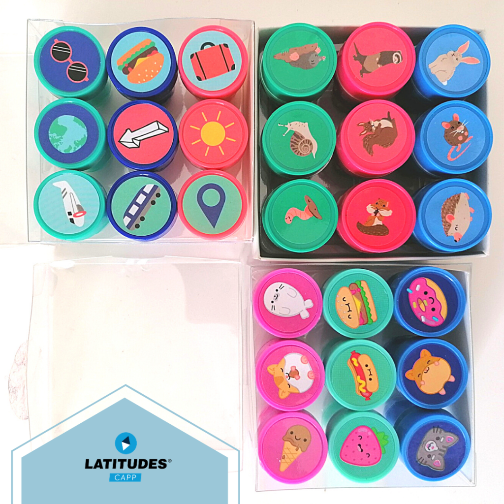 É possível encontrar vários tipos de imagens, em conjuntos de 9 carimbos categorizados com animais, alimentos, objetos…