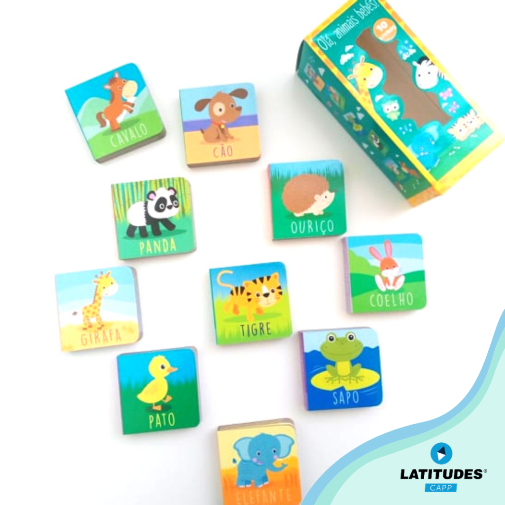 São 10 livros pequenos, correspondentes a cada um dos animais – cavalo, cão, panda, ouriço, girafa, tigre, coelho, pato, sapo, elefante.