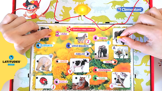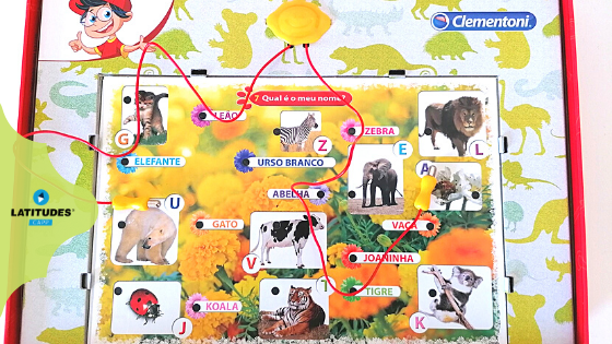 Este jogo apresenta: dois pinos interativos que quando são ambos colocados nas respostas correspondentes acende uma luz que dá o reforço positivo de que acertou! É ainda composto por 12 atividades com mais de 100 perguntas.