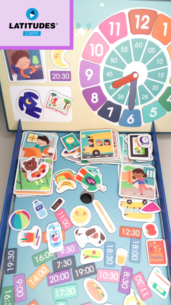 Este jogo é ideal para que as crianças aprendam de uma forma lúdica as horas e que aprendam ainda a ter uma maior noção do dia a dia e quando é que acontecem as suas rotinas diárias.