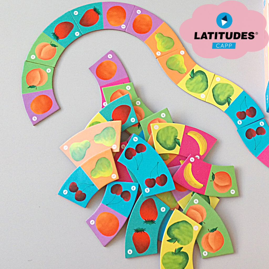 Este jogo de Dominó apresenta 7 frutas diferentes (maçã, banana, cerejas, pera, pêssego, laranja e morango) cada uma das frutas apresenta um fundo de cor diferente e ainda estão numeradas de 0 a 6, o que possibilita distinguir as peças, para além do desenho. O jogo consiste no emparceiramento que deve ser feito a cada peça, o que possibilita a criança de desenvolver a sua capacidade de raciocínio e coordenação visuo-motora para o encaixe correto.