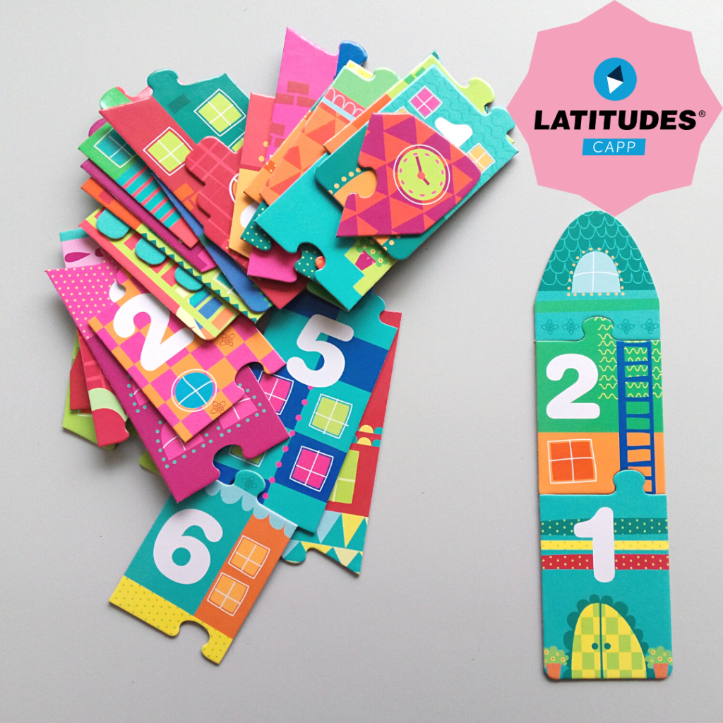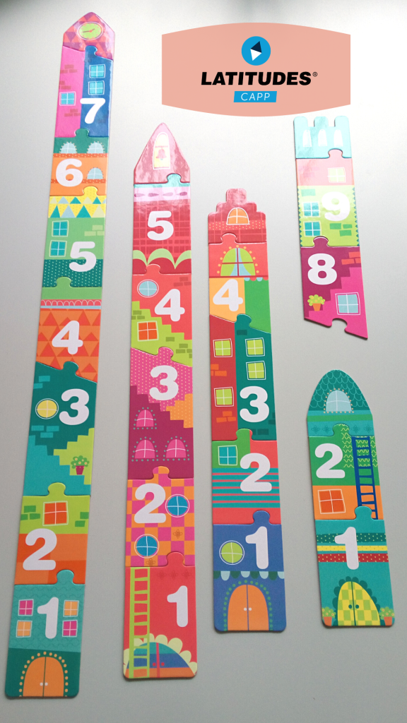 Este puzzle é diferenciado por ser vertical e pode ser montado de diferentes formas, apesar de só ser possível o encaixe do número seguinte. As peças são grandes e por esse mesmo motivo é ideal para o fazer no chão com o maior espaço possível. Depois de concluído este puzzle tem a particularidade de formar vários “prédios” com os seus respetivos telhados. As peças são numeradas do 1 ao 9 e é possível formar 5 “prédios”. É ideal para explorar a motricidade fina na destreza de manuseamento das peças, o raciocínio para o encaixe das mesmas e a noção da relação número/quantidade.