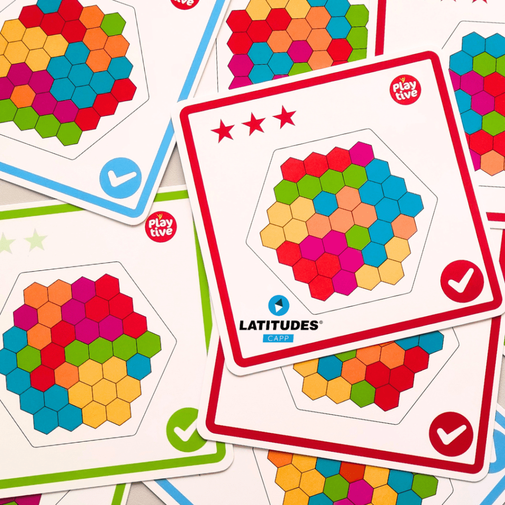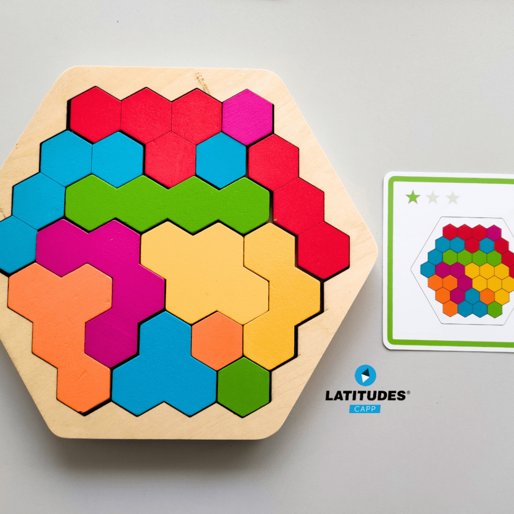 Esta atividade permite que a criança possa livremente explorar as diversas competências primárias como a motricidade fina na destreza de manuseamento das peças, quantidades e o raciocínio para o encaixe e obtenção de imagens/formas geométricas.