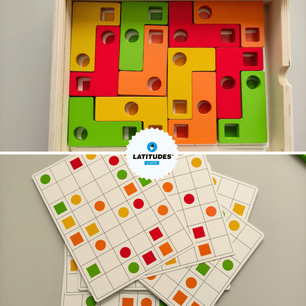 Esta atividade permite estimular a criança ao nível da motricidade fina, ou seja, na destreza de manuseamento das peças, quantidades e raciocínio dedutivo para o encaixe das peças nas formas geométricas desenhadas nos cartões.